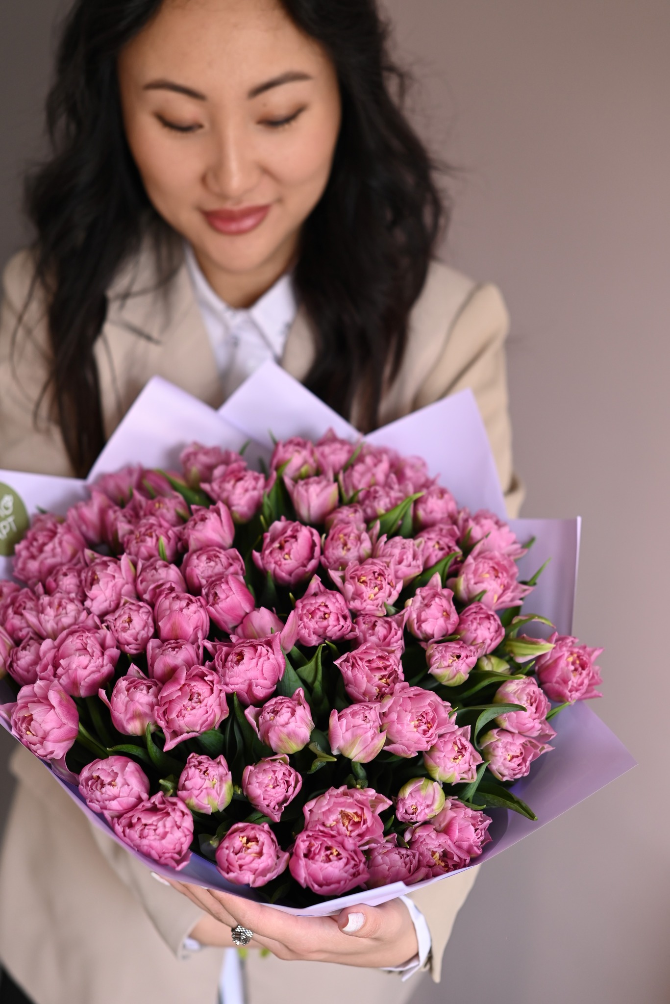 Сереневые тюльпаны дарят ощущение гармонии, вдохновения и тепла, а их изысканный вид создает атмосферу праздника и роскоши. Подарите этот великолепный букет — и пусть его красота и масштаб говорят за вас, подчеркивая, как важно для вас счастье и улыбка близкого человека!