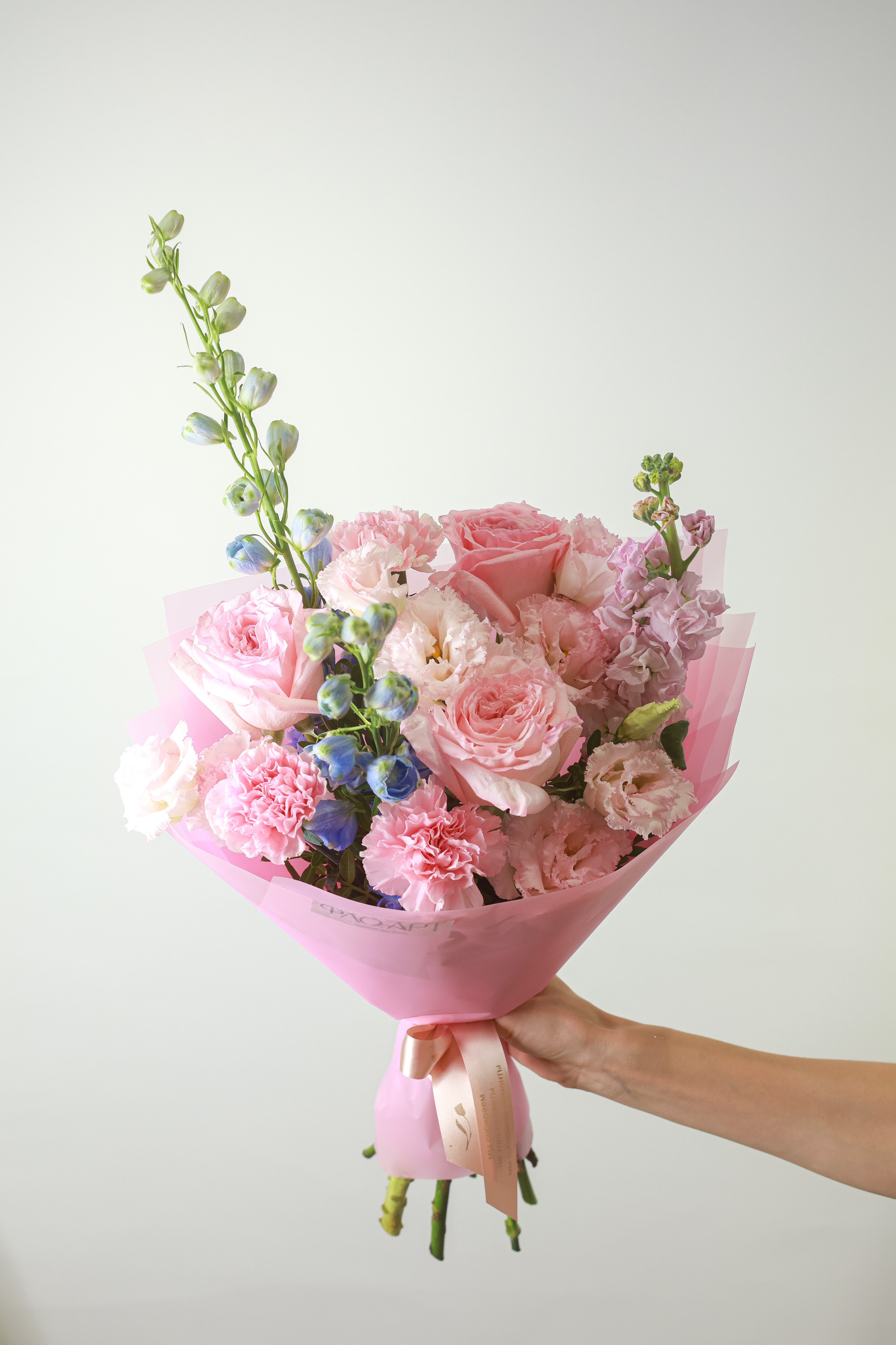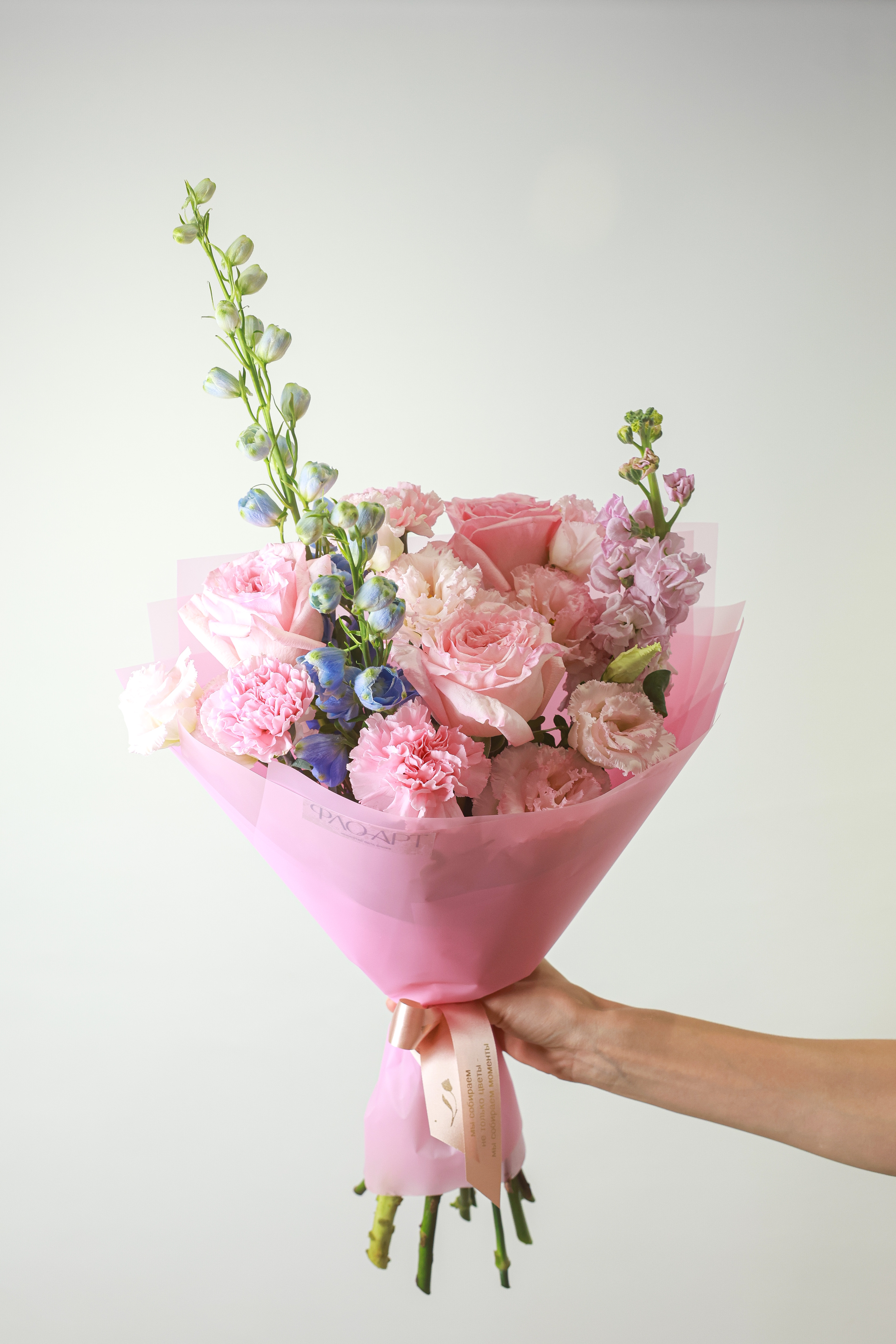 Нежный букет из пионовиных роз, дельфиниума, фактурного диантуса и лизиантуса