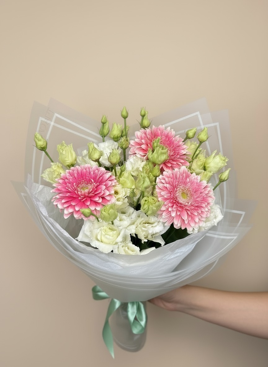 Прекрасный букет с махровой герберы и стойкого лизиантуса