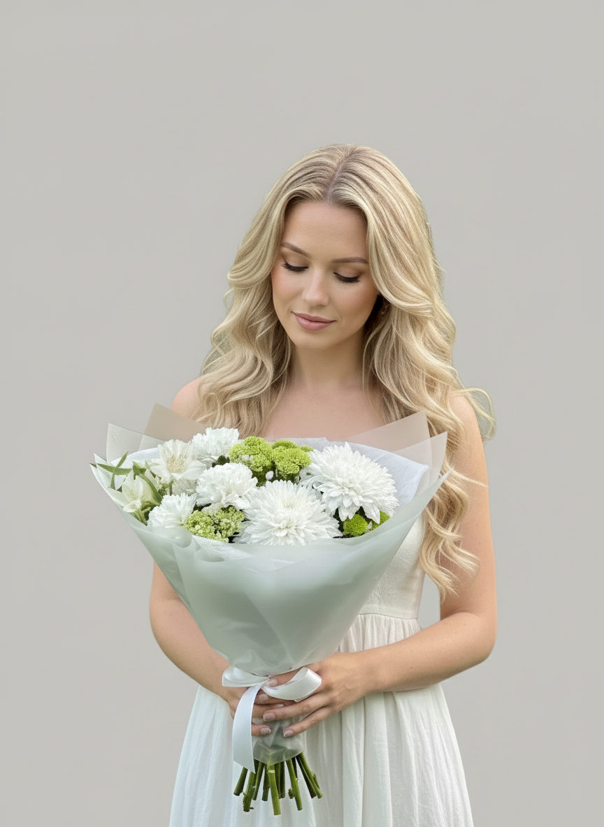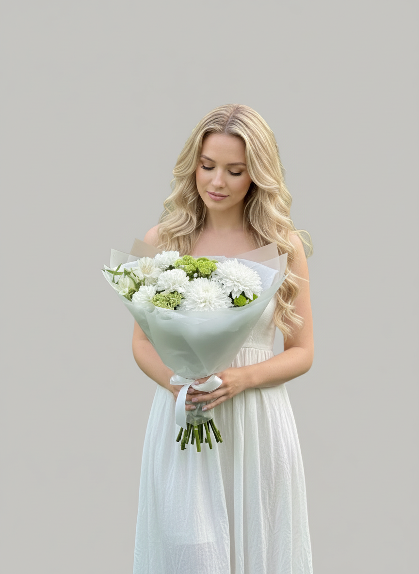 Букет, который дарят с искренними намерениями, здесь одноголовая хризантема, кустовая хризантема, воздушный вибурнум, фактурные диантусы и стойкая альстромерия создают микс чистоты