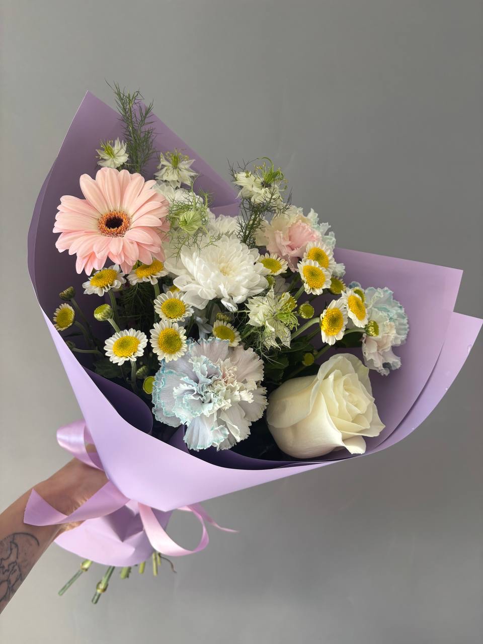 Нежный букет с солнечными сантини, нежной герберой мини, радужными диантусами и чувственной нигеллой порадует любую особу.