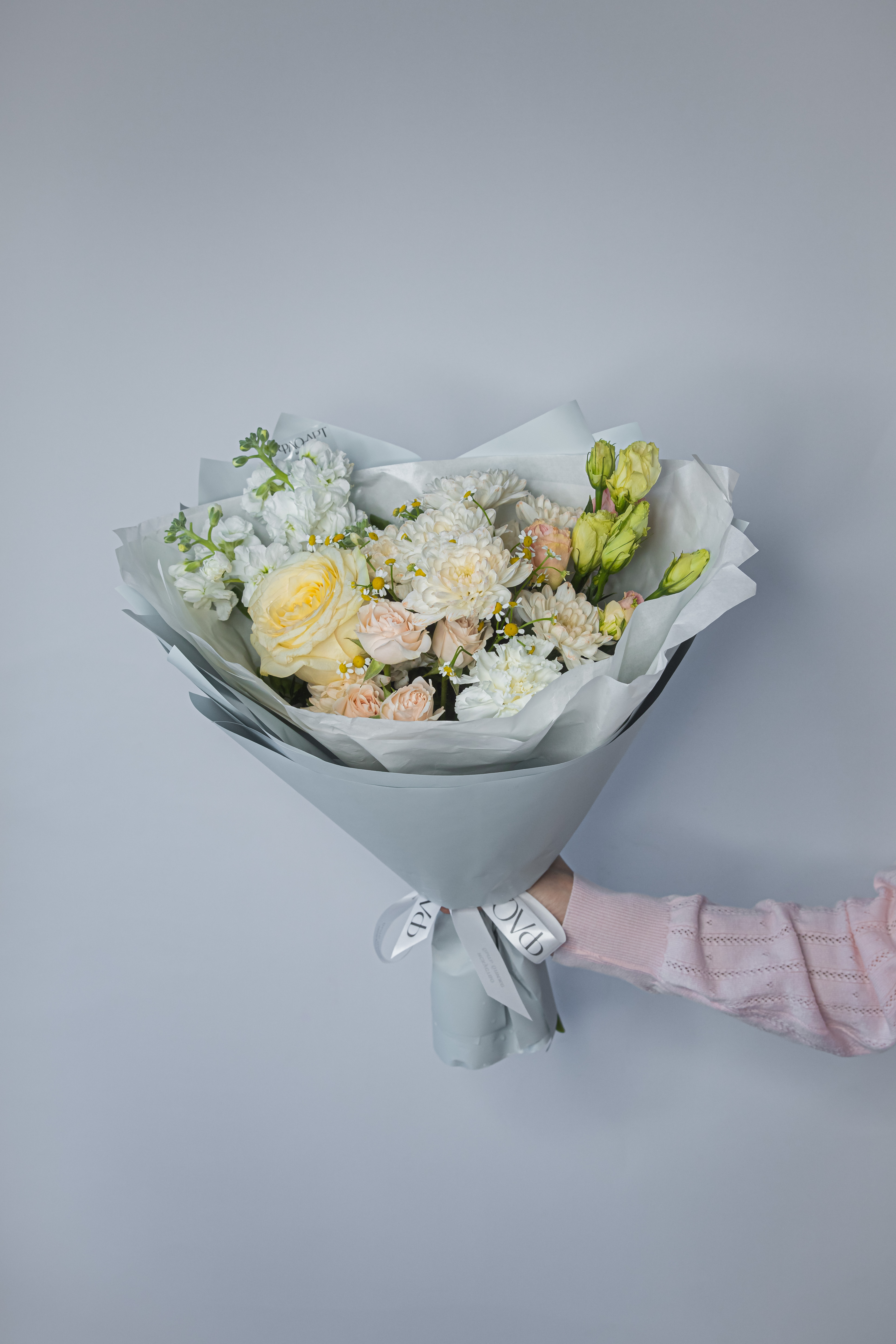 Нежный букет, состав которого порадует любую девушку: хризантема кустовая, пионовидная одноголовая роза, ароматная маттиола и стойкие диантусы.