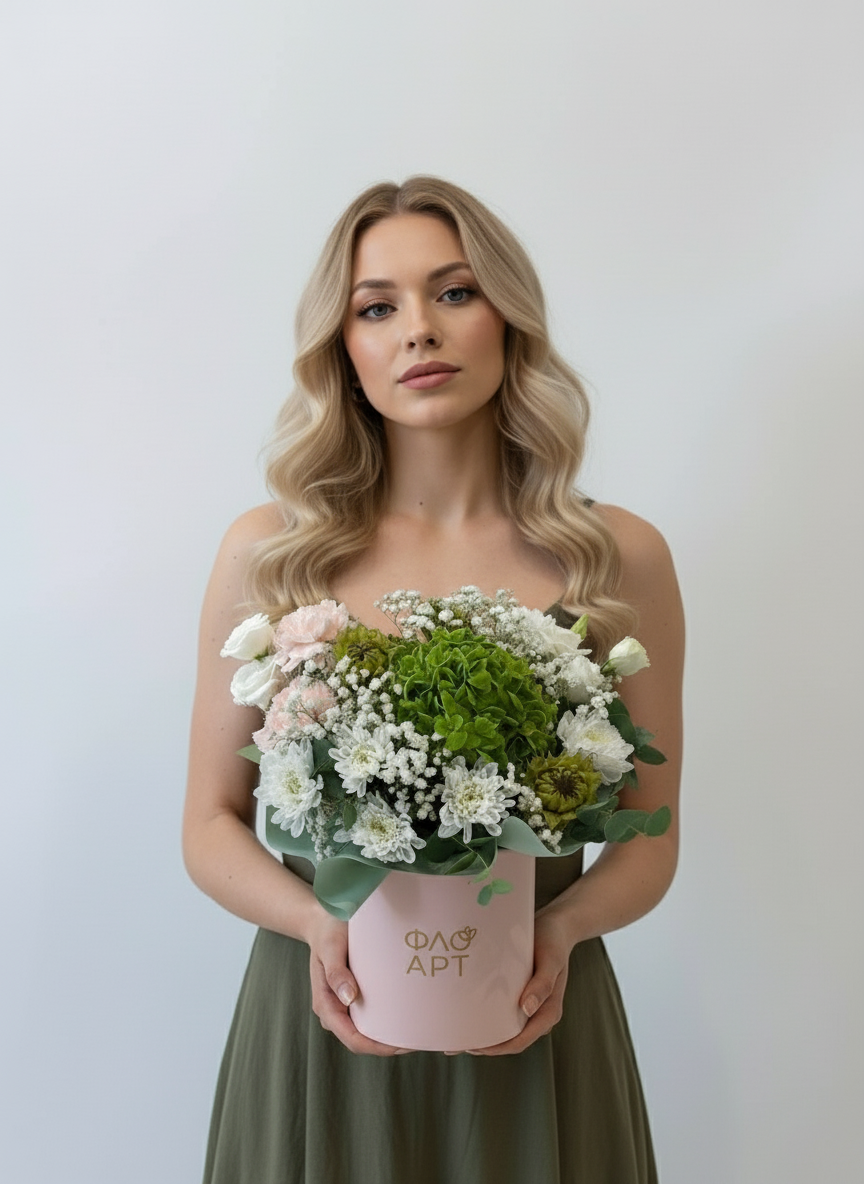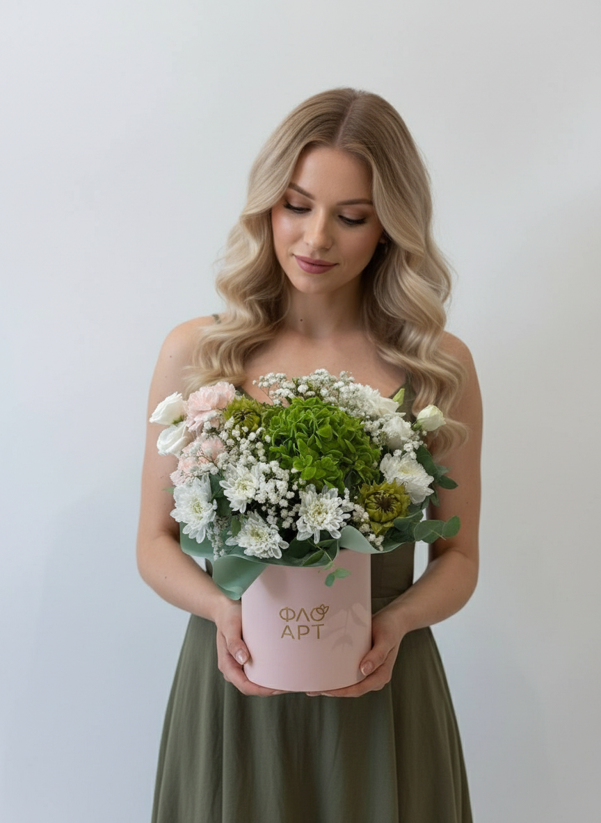 Осенняя композиция с сезонной гортензией, нежной гипсофилой, стойкими диантусами и фактурными лизиантусами