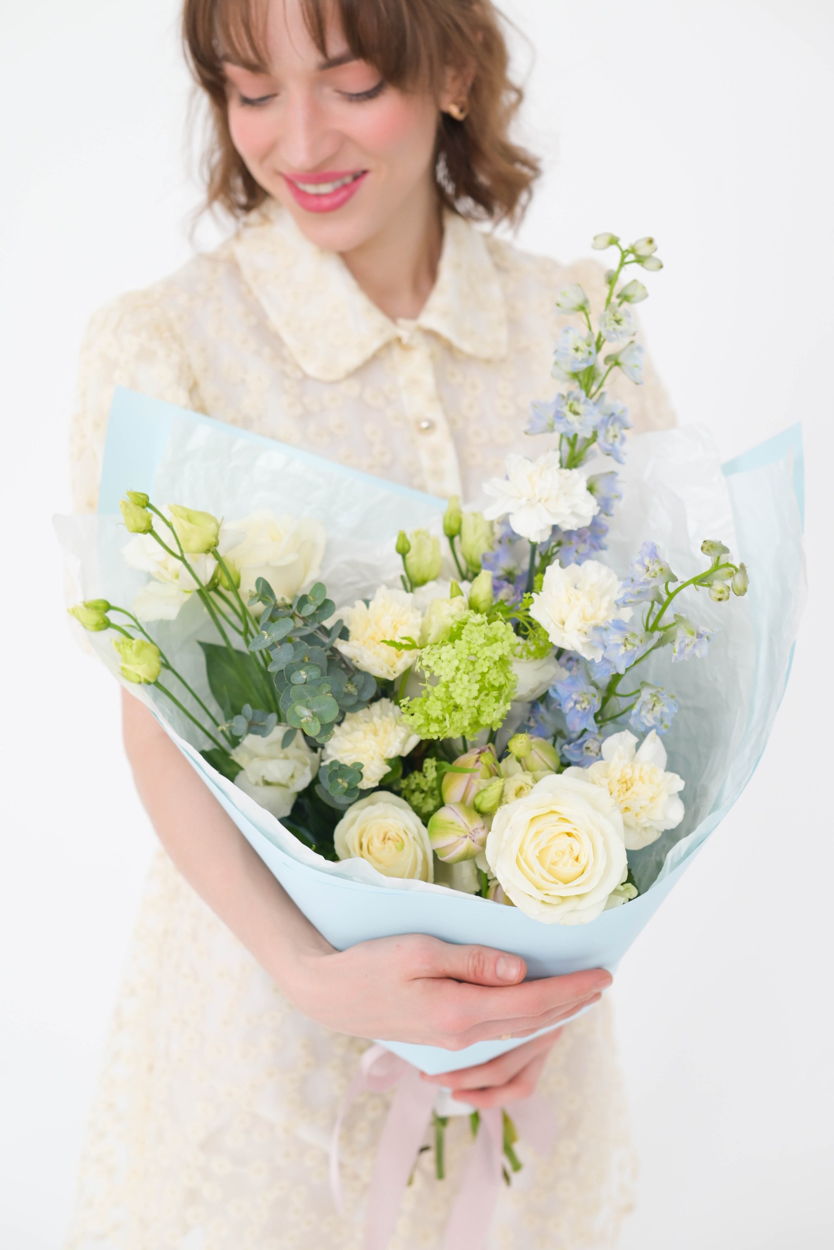 Чарующий аромат дельфиниумов, пионовидной розы и весенних тюльпанов украсят ваш праздник.