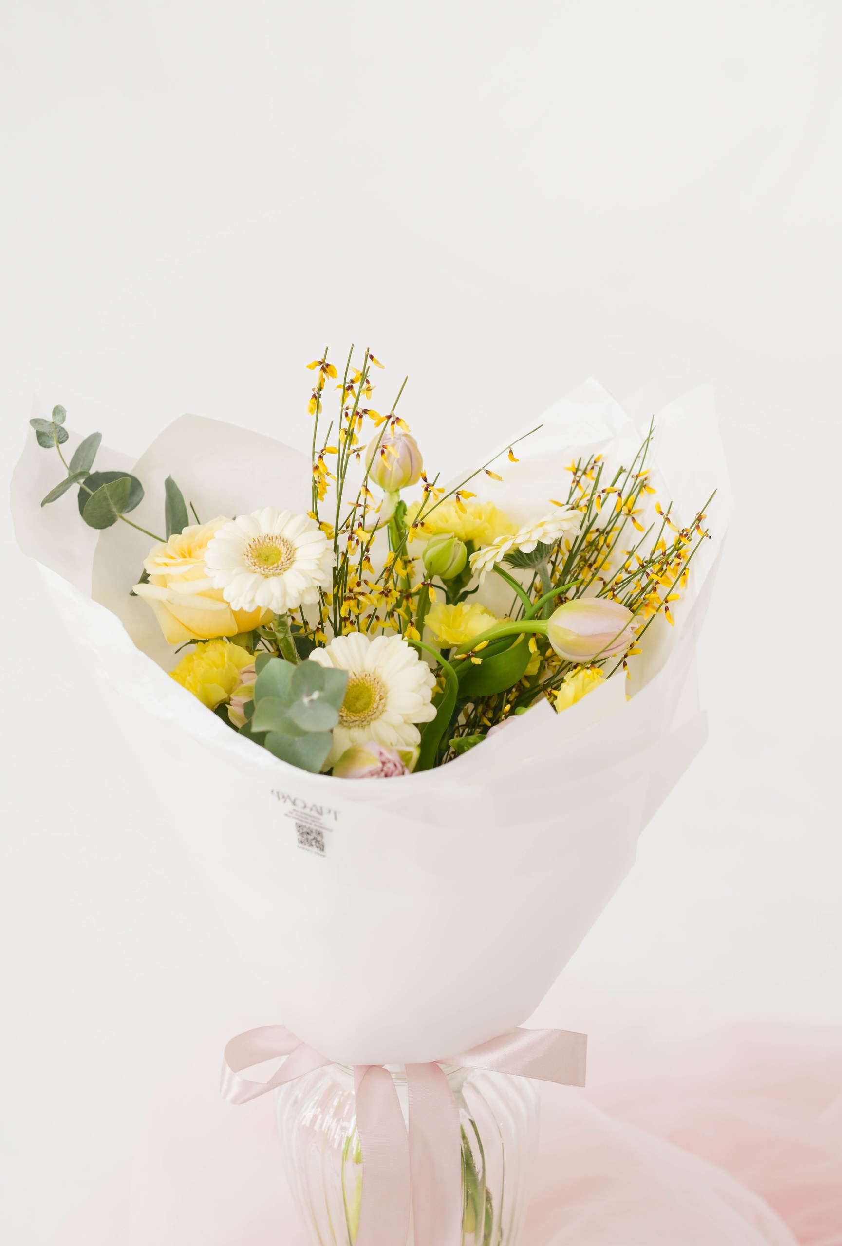 Нежный весенний микс из ароматной генисты, тюльпанов и ненавязчивых гербер станет прекрасным символом пробуждения от зимы