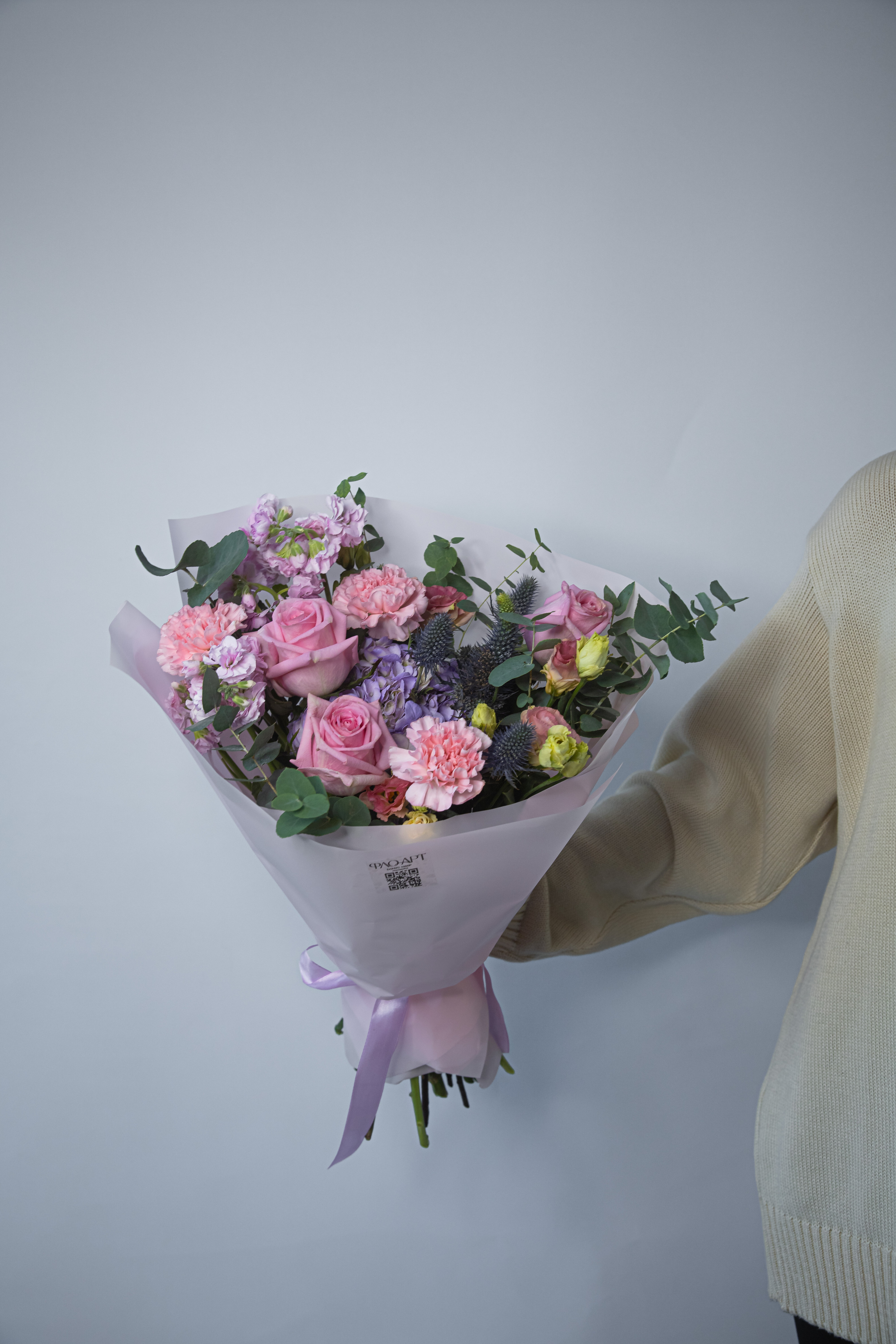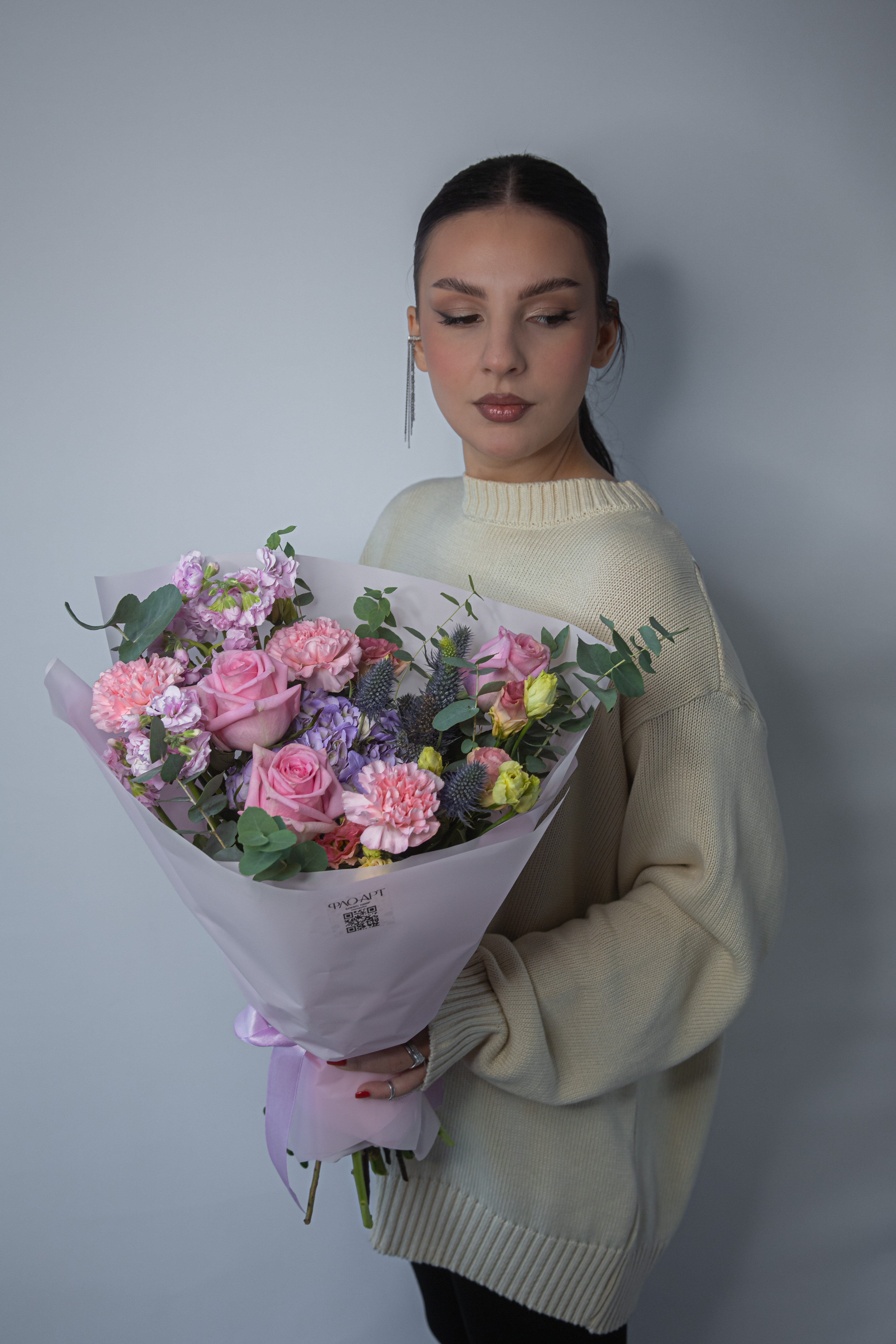 Сборный букет из самых экзотических цветов: гидрангия, эрингиум, пионовидная роза, лизиантуса, кустовой маттиолы, диантусов и эвкалипта.
