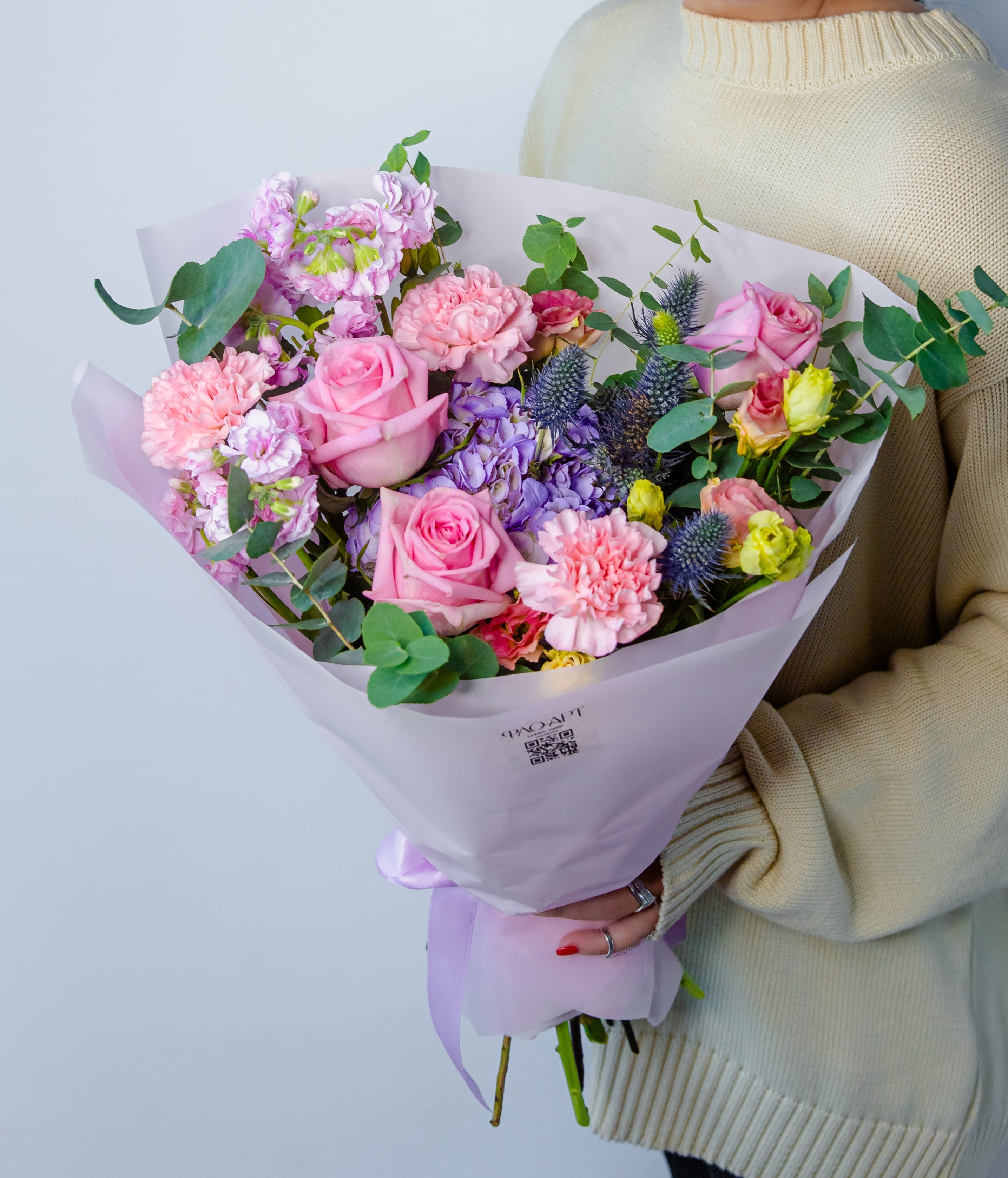 Погрузитесь в атмосферу тропиков с нашим эксклюзивным букетом! Экзотическое сочетание гидрангии, эрингиума, пионовидной розы, лизиантусы, кустовой маттиолы, диантусов и ароматного эвкалипта подчеркнет вашу уникальность и создаст незабываемое впечатление. Идеальный подарок для тех, кто ценит красоту и оригинальность!
