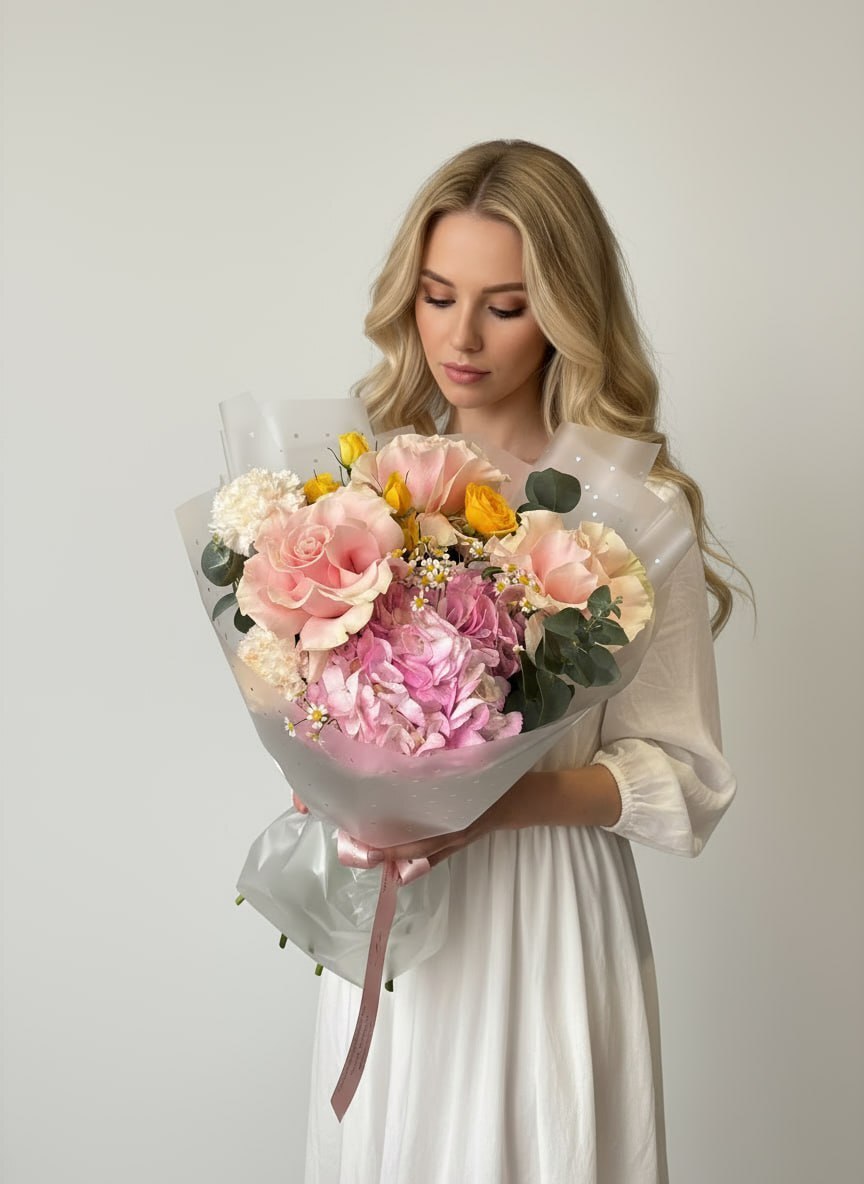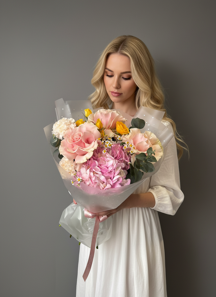 Нежный букет из гортензии, пионовидных роз, стойких диантусов, нежного танацетума и зелени для любимой мамы
