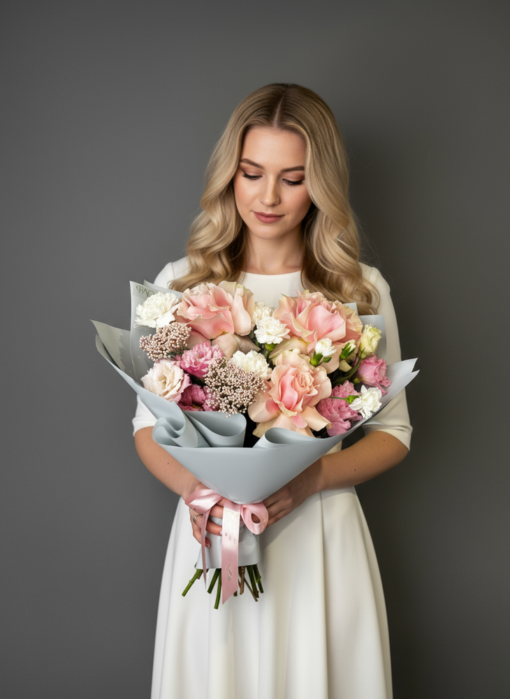 Нежный букет с пионовидными розами, озотамнусом, кружевными лизиантусами, стойкими диантусами порадует вашу маму