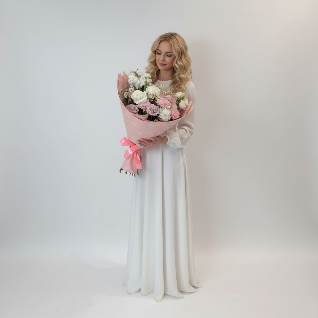 Нежность фактурных диантусов, ароматной маттиолы, стойких лизиантуса и кустовой хризантемы создали удивительно притягательный микс, говорящий о чувствах!