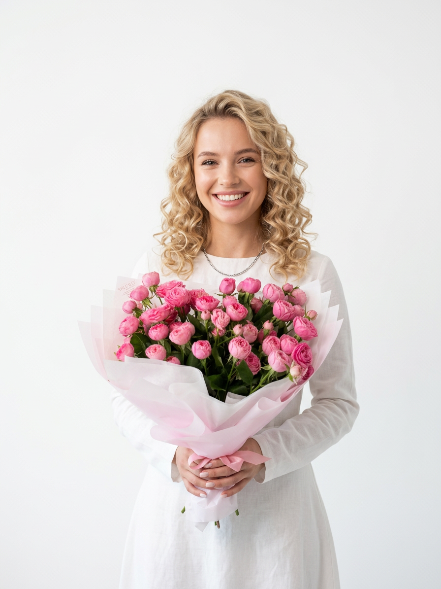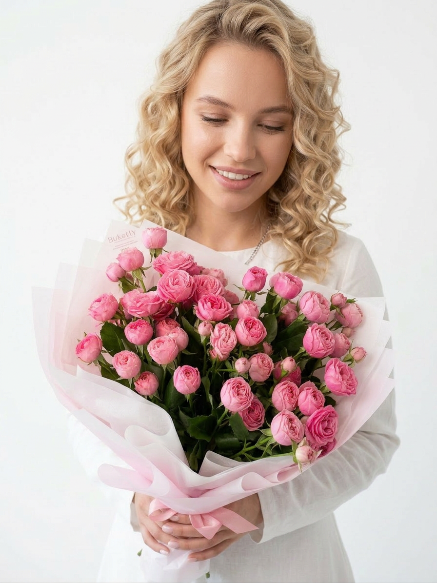 Пышные розовые кустовые розы с бархатистыми лепестками создают лёгкий объём, а эвкалипт добавляет свежести. Упаковка в пастельных тонах с кружевом и лентами придаёт композиции изысканность.