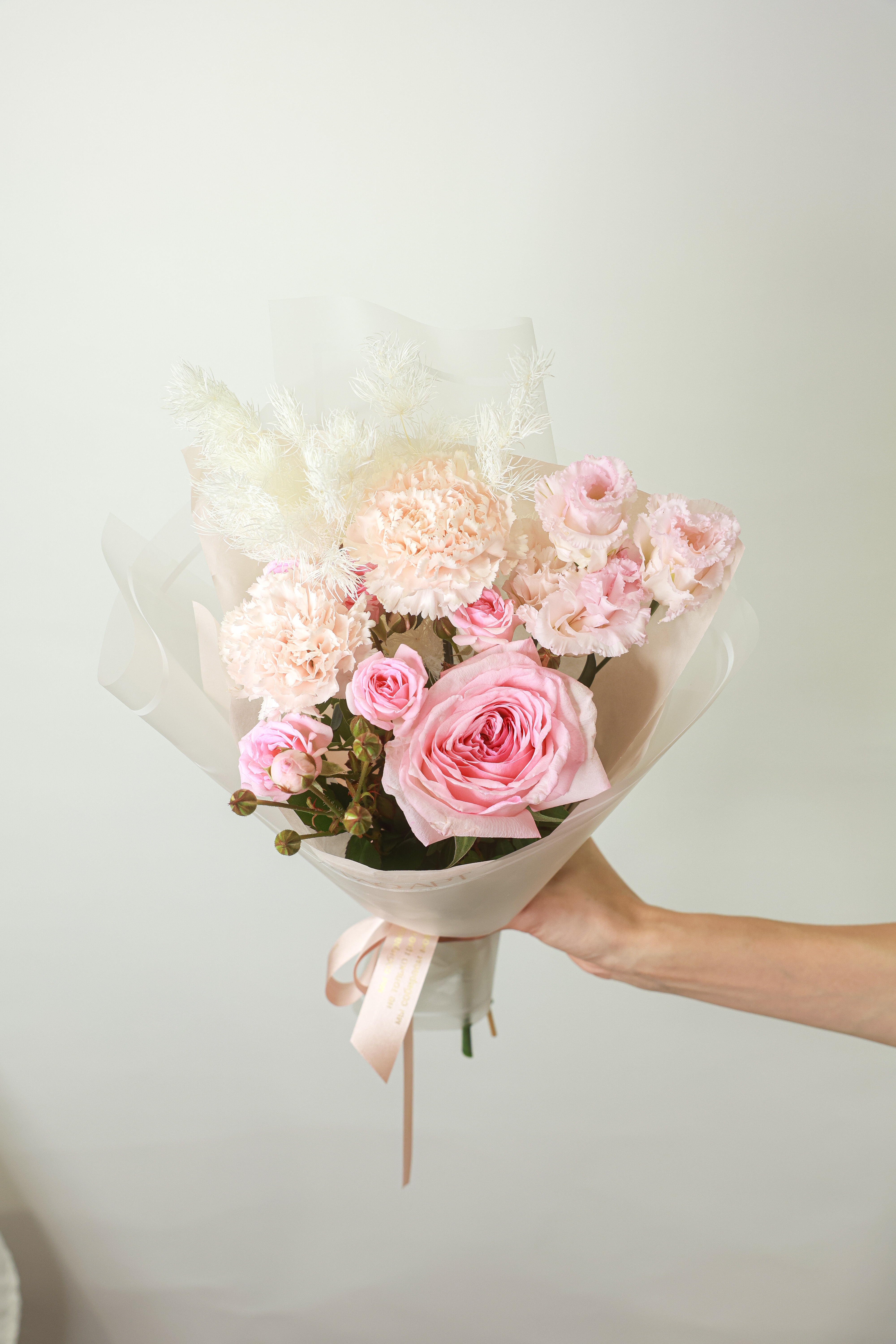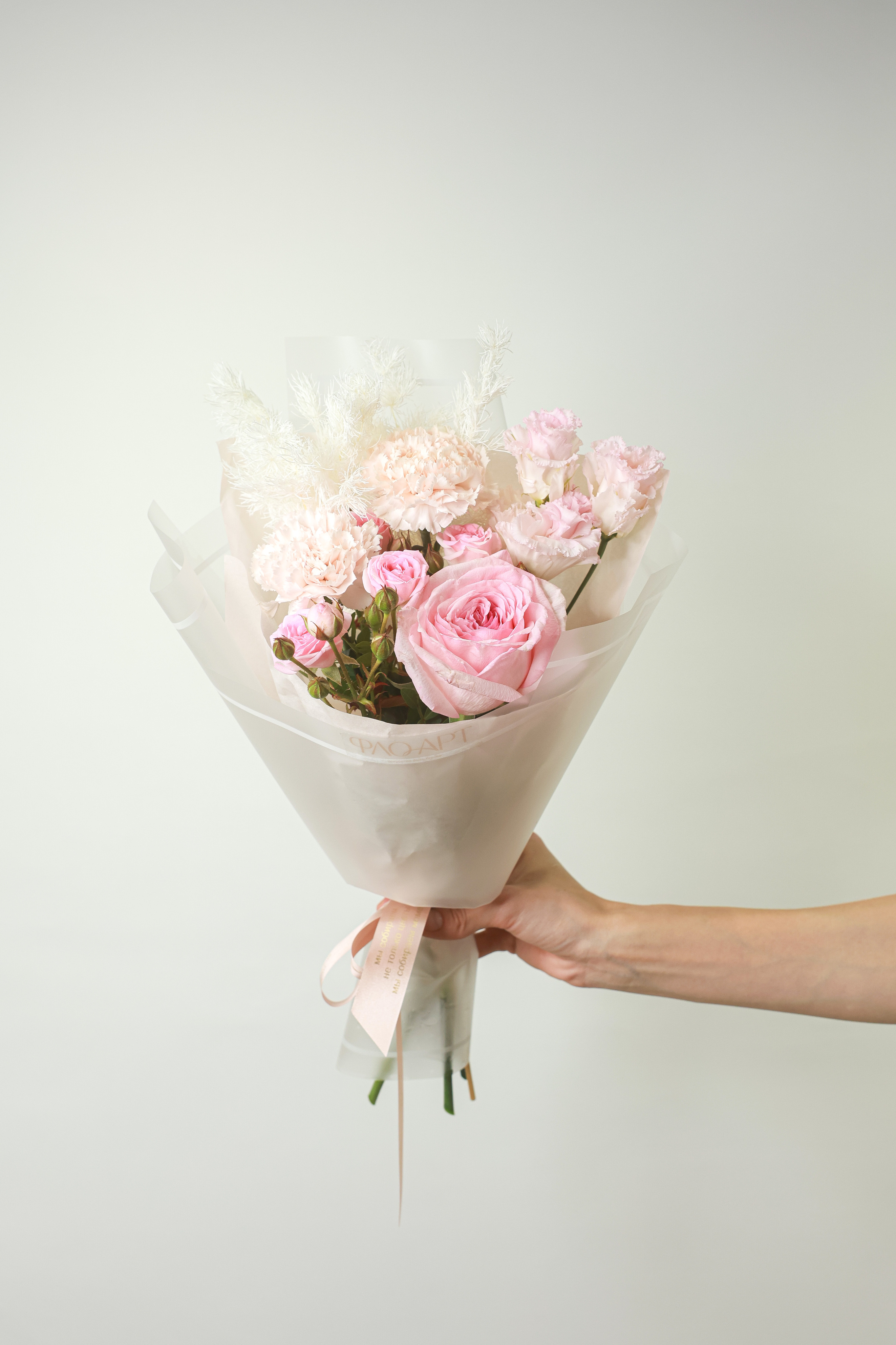 Нежный микс пионовидной розы, кустовой розы, диантусов и лизиантусов