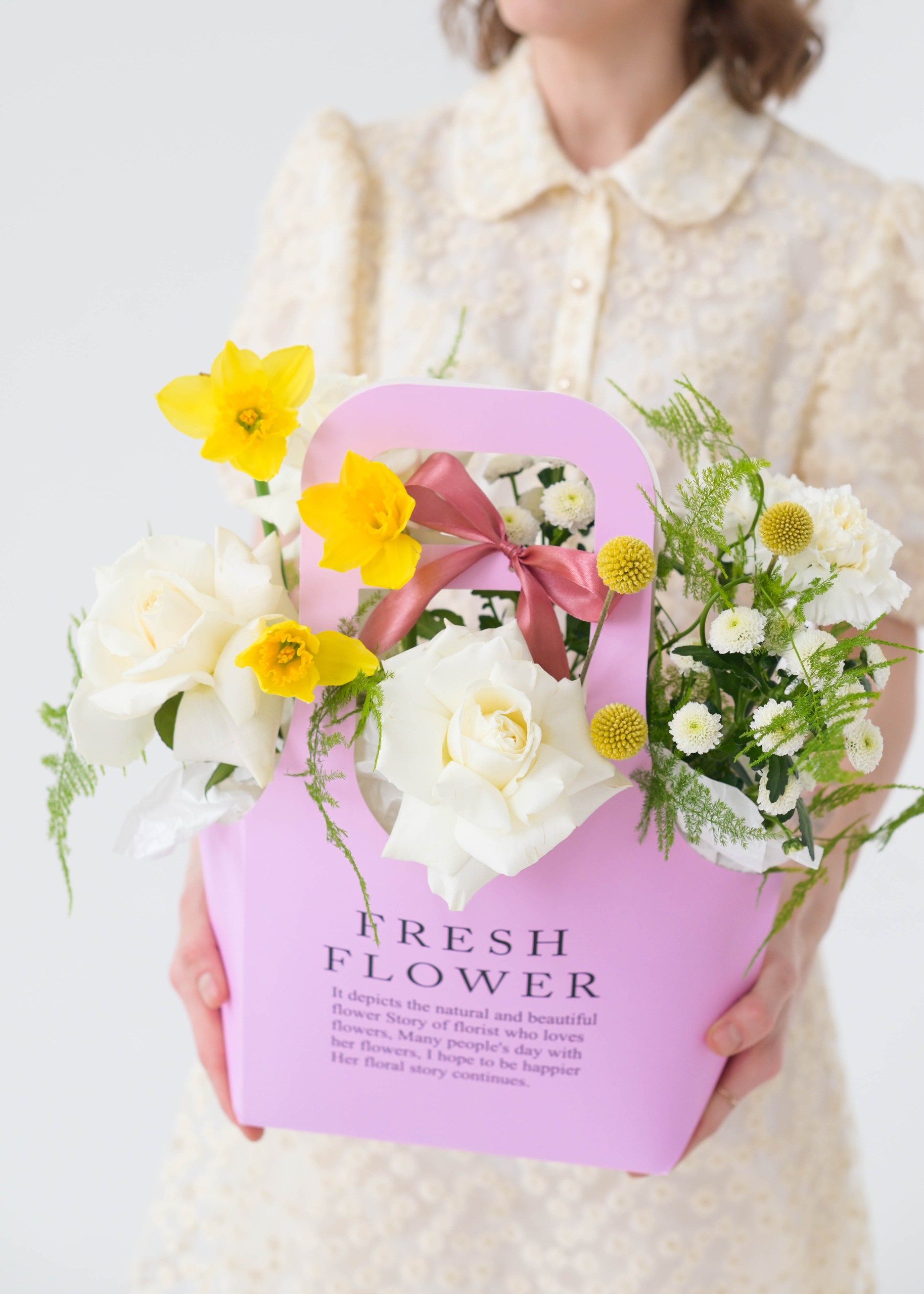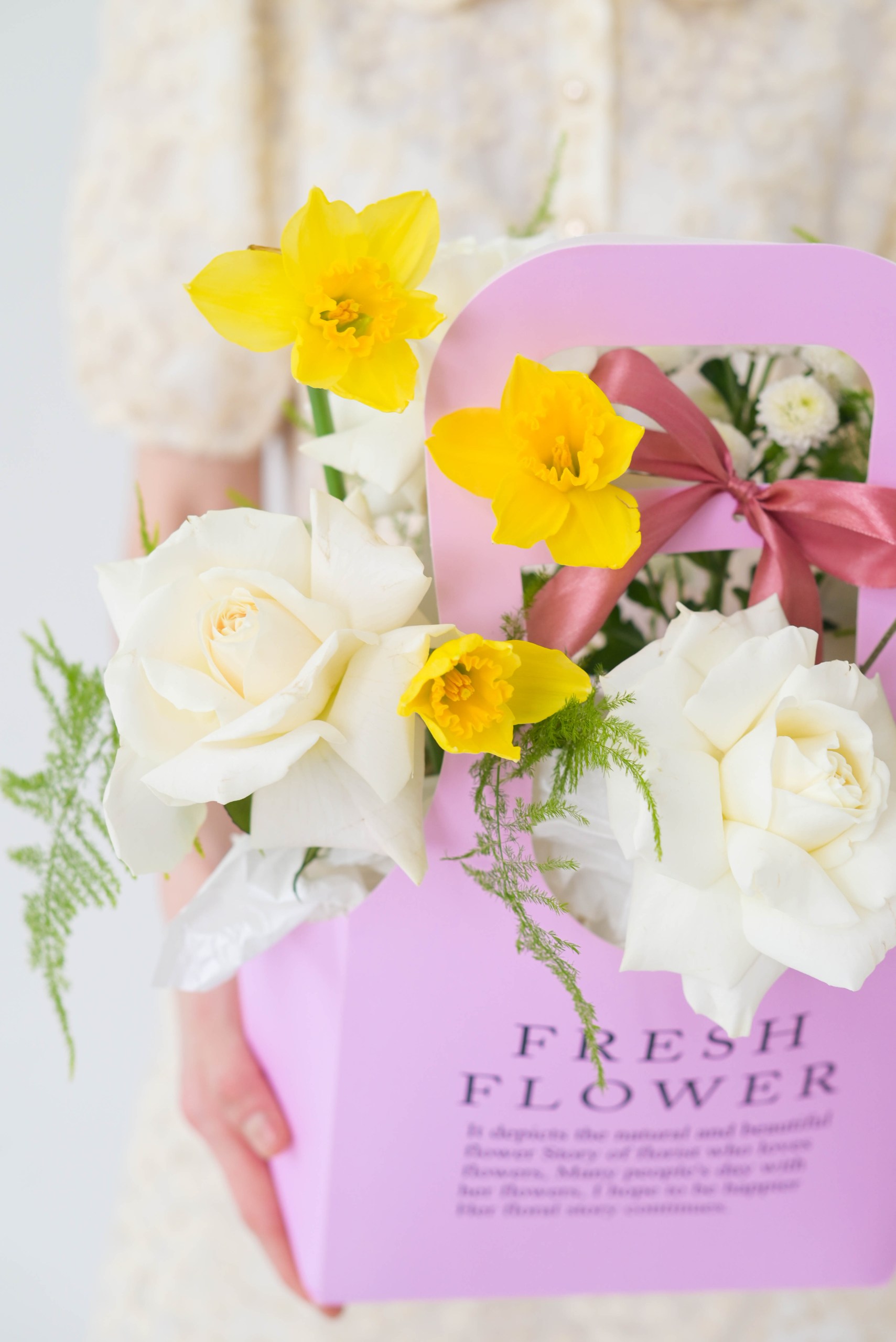 Чарующий микс ароматной розы, стойких сантини и ярких нарциссов, символизирующих искренность.