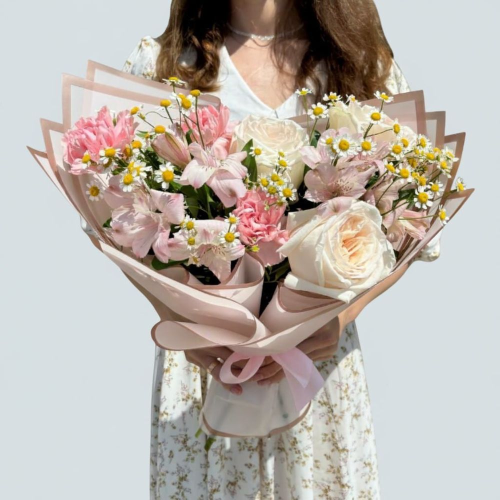 Альстромерия символизирует дружбу и поддержку, ромашки олицетворяют искренность и чистоту отношений, диантус добавляет нотку романтики, а розы премиум-класса подчеркивают вашу заботу и уважение.