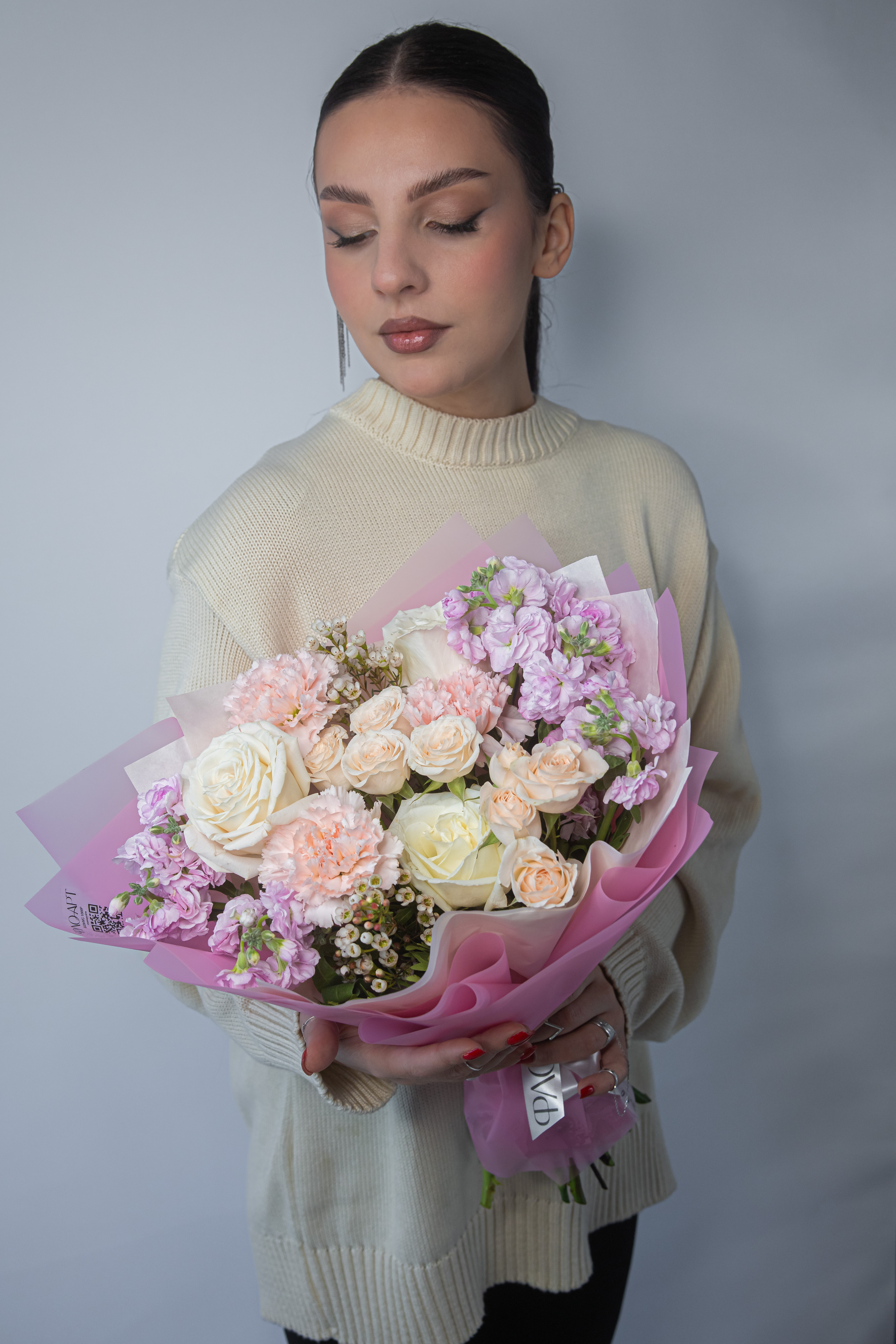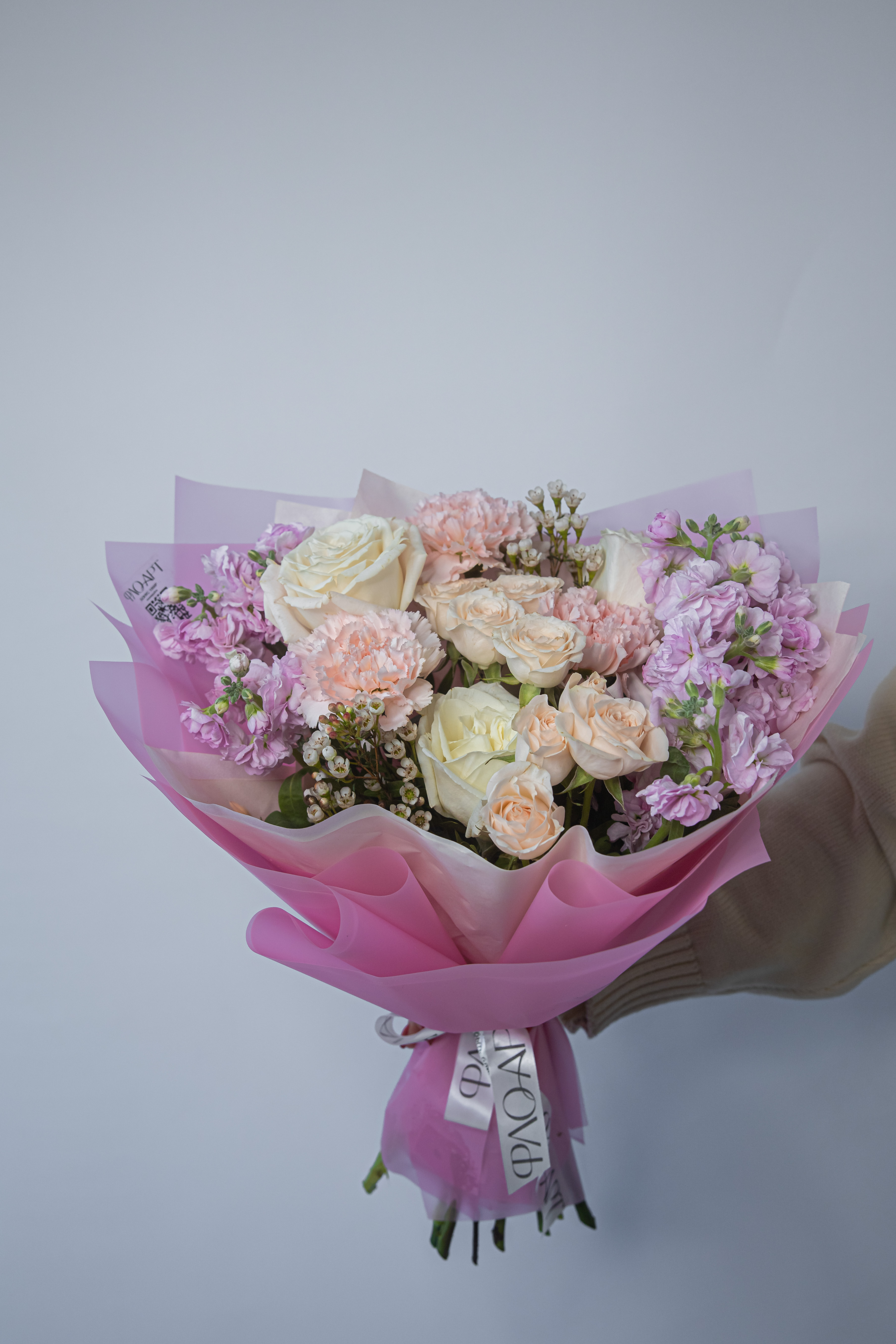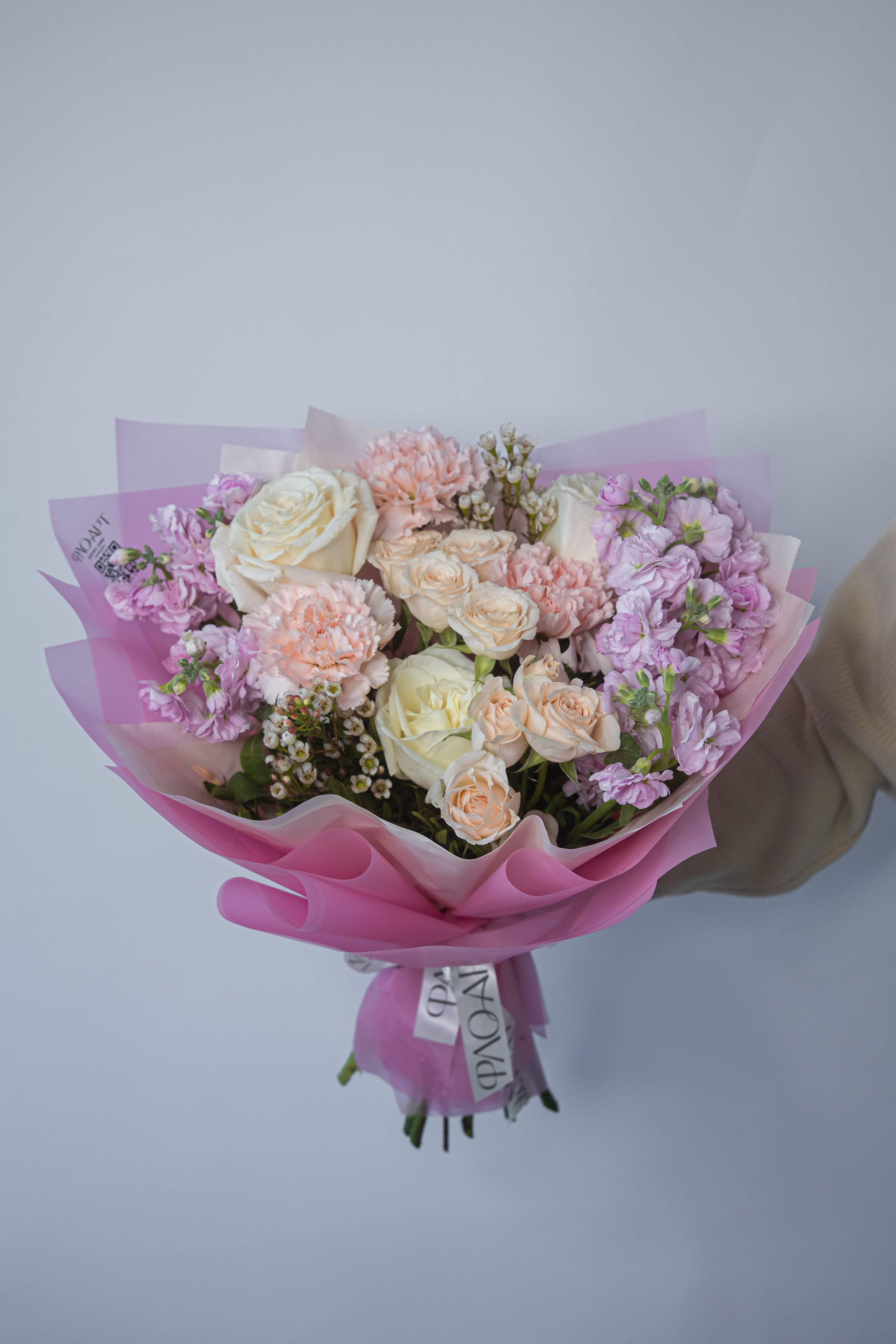 Нежный букет, который шепчет о трепетных чувствах, собран из пионовидной розы, Ароматной маттиолы, фактурного диантуса и чувственного хамелациума