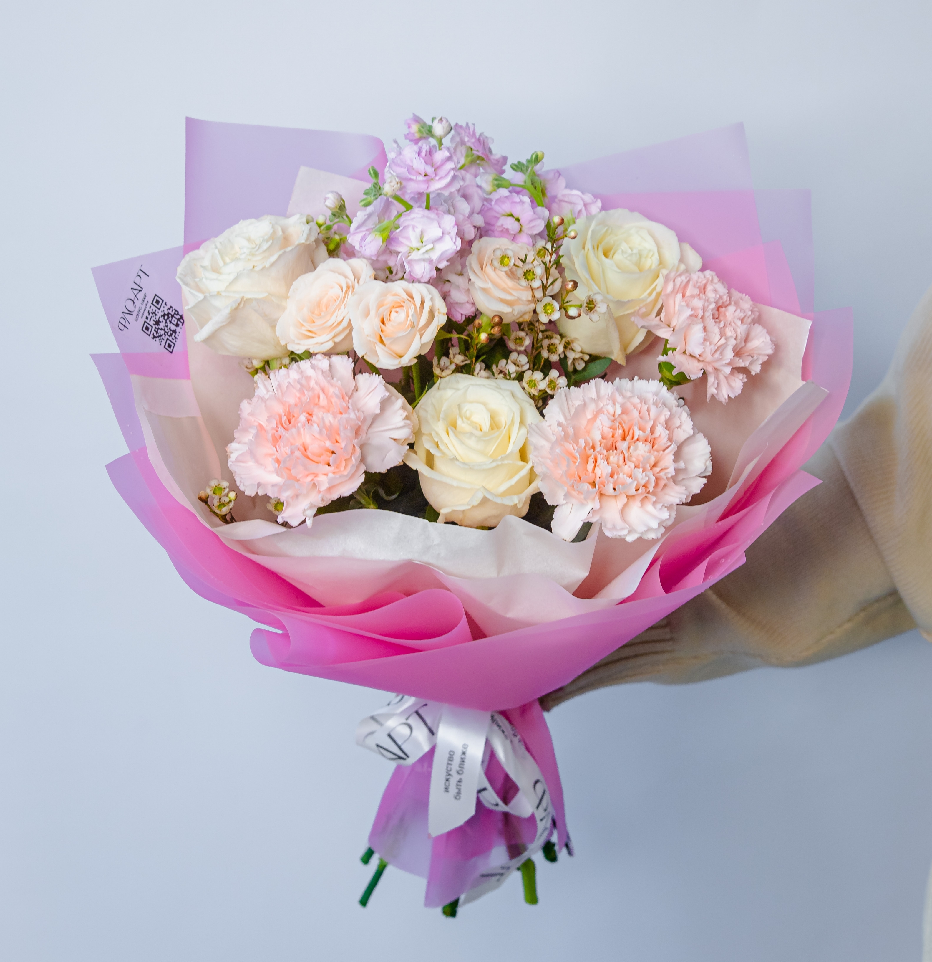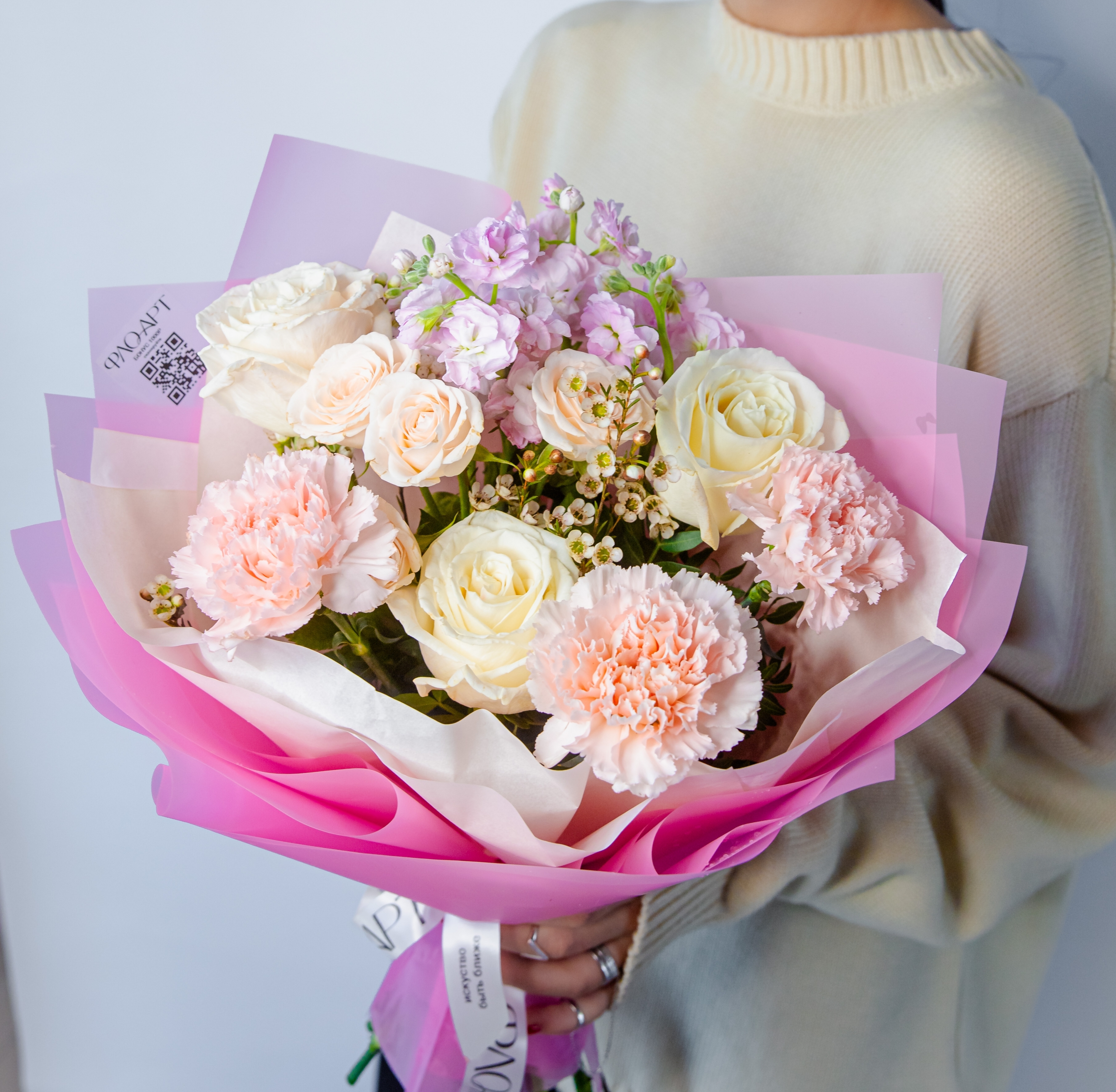 Нежный букет, который шепчет о трепетных чувствах, собран из пионовидной розы, Ароматной маттиолы, фактурного диантуса и чувственного хамелациума