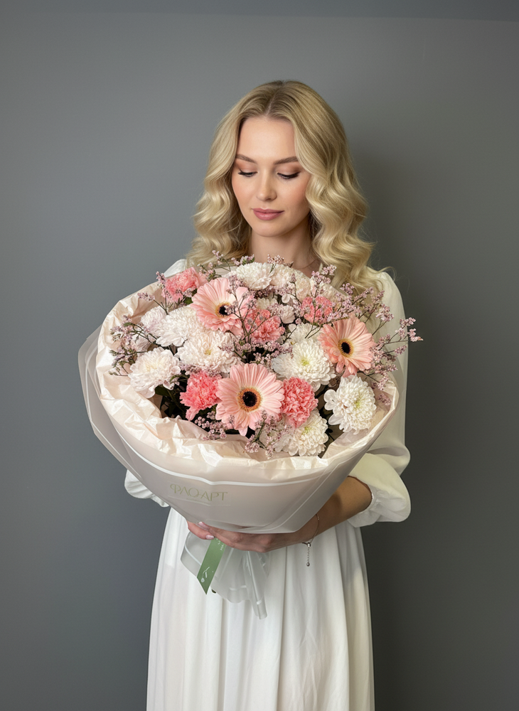 Лучший подарок маме в День матери! Стойкий букет из кустовой хризаментемы, нежных гербер и кружевных диантусов