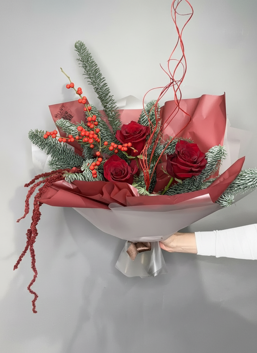 Красный зимний букет, символизирующий уверенность, успех и богатство.