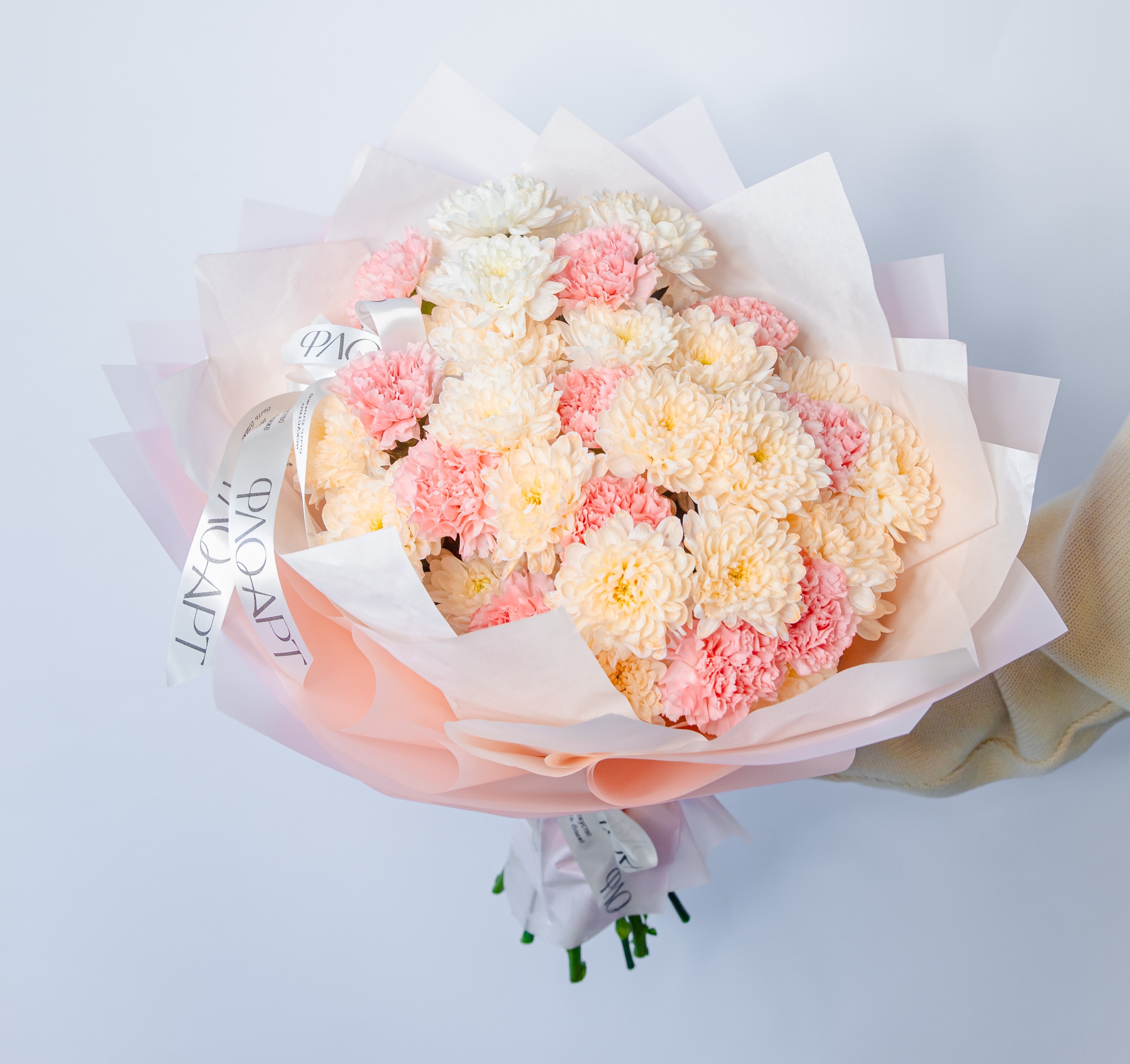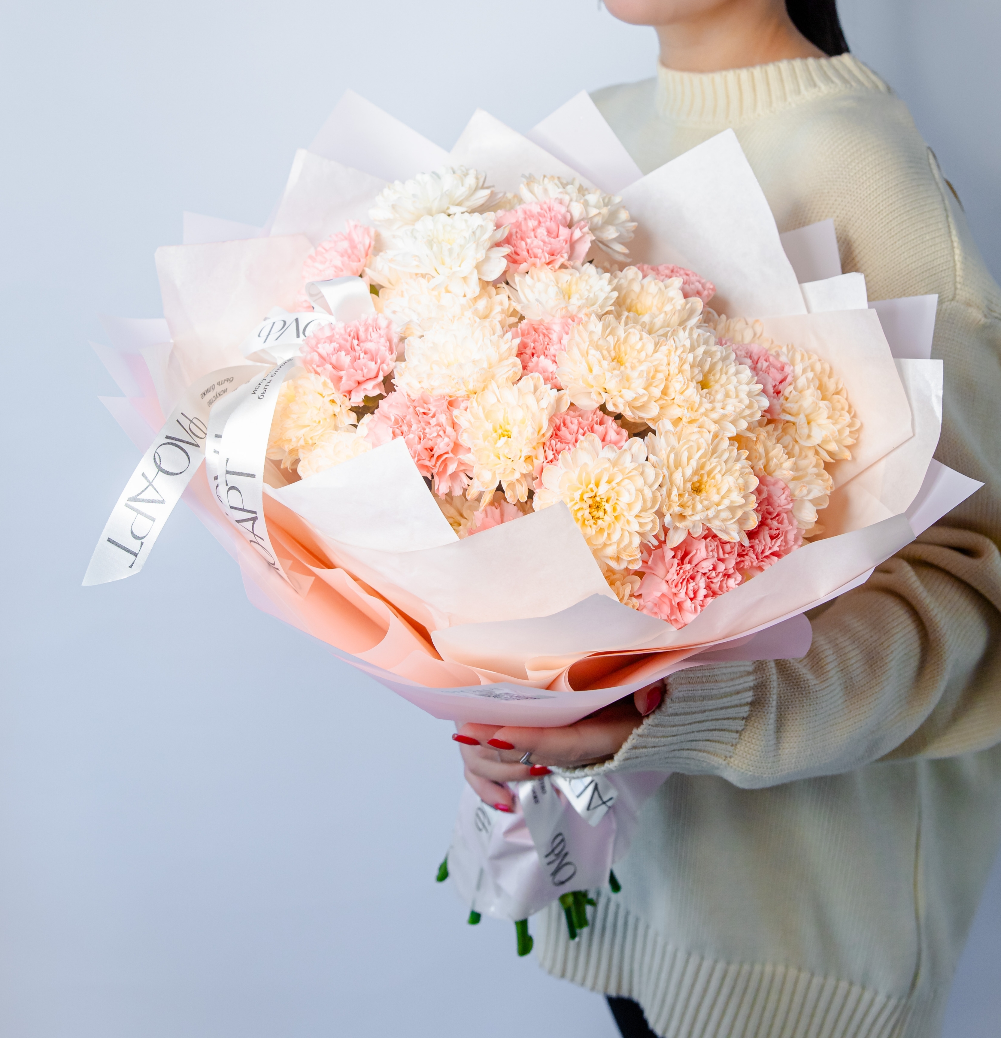 Стойкий букет из кустовой хризантемы и фактурных диантусов, который будет радовать долгое время