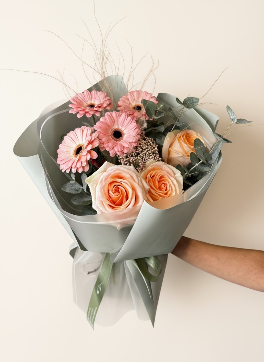 Нежный букет с герберой мини и ароматными пионовидными розами, который попадет в самое сердце